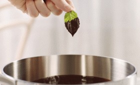 2. Holding the leaf’s stem with your fingers, dip the mint leaves into the chocolate and place on a baking sheet covered with parchment-paper.