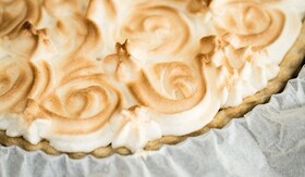 Beat the egg whites until they are stiff, add the brown sugar and continue to beat. Once done, add icing sugar using a spatula and blend nicely. Place the meringue in a pastry bag and decorate the pie with it.