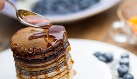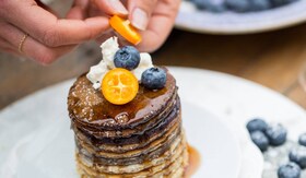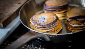 When it’s time to serve, use a cutter to refine the pancakes and better see the colours. Pour some caramel on top and taste while it’s still hot.