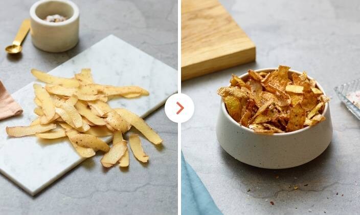 1Πατατάκια από φλούδες πατάταςΣυνήθως, όταν μαγειρεύουμε πατάτες, οι φλούδες τους πετιούνται. Αντί να τις πετάξετε, ψήστε τις στον φούρνο με λίγο ελαιόλαδο και μια πρέζα αλάτι. Κεράστε τους καλεσμένους σας ένα νόστιμο και τραγανό σνακ πριν από το γεύμα.
