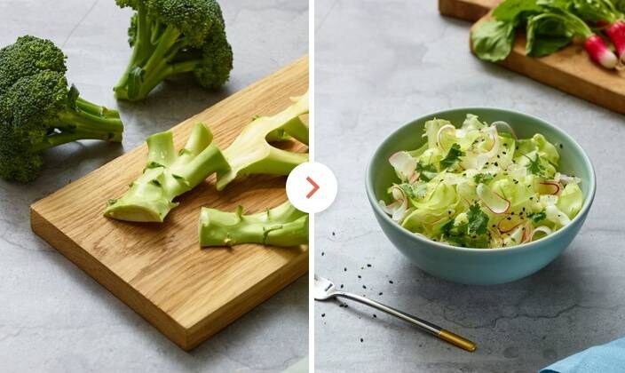 3Σαλάτα με κοτσάνια μπρόκολουΦυλάξτε τα κοτσάνια! Τα κοτσάνια, που αποτελούν περισσότερο από το μισό μπρόκολο, είναι εξίσου θρεπτικά με τα άνθη. Κόψτε τα κοτσάνια σε λεπτές φέτες με έναν αποφλοιωτή και αναμίξτε τα με τα αγαπημένα σας υλικά για σαλάτα.